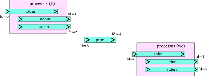 Nous allons voir maintenant que chaque processus possède à sa création trois pipes nommés stdin, stdout, et stderr.